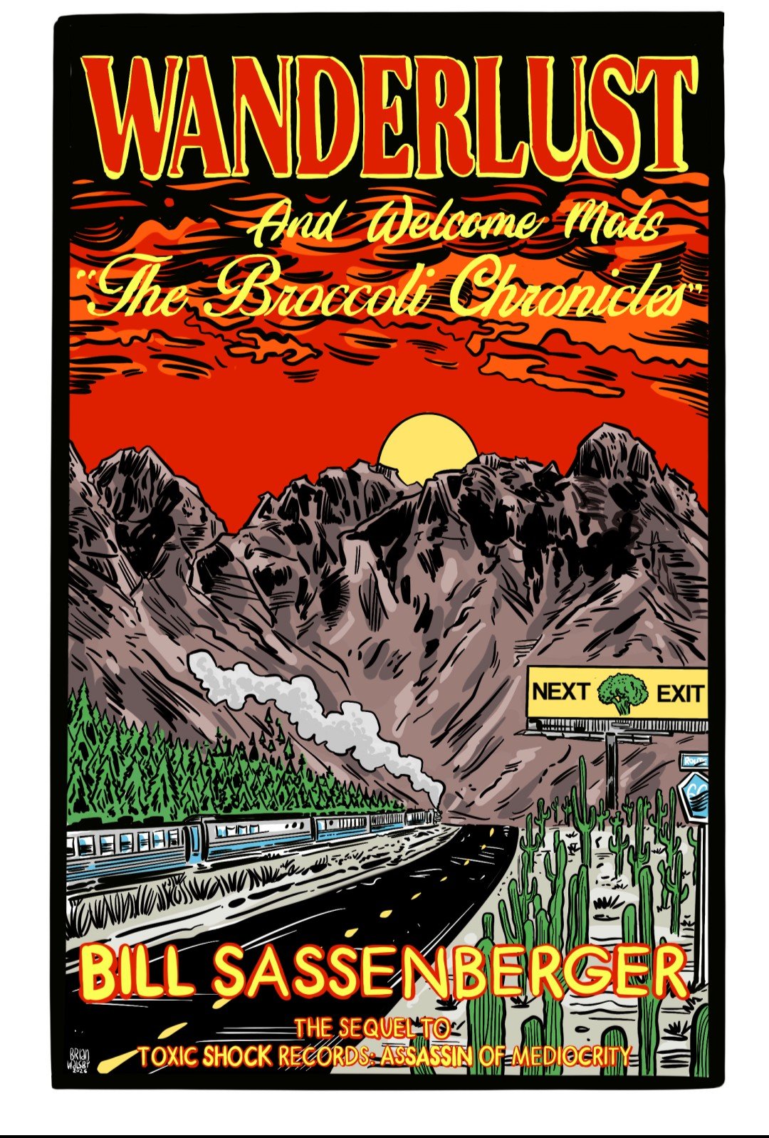 WANDERLUST and WELCOME MATS the Broccoli Chronicles, the Sequel to TOXIC SHOCK Assassin of Mediocrity Book by Bill Sassenberger. This 158 page profusely illustrated full-color book covers the life of a punk rock innkeeper, as he becomes a successful author. After closing his record shop, becoming a widower and being laid off from his day job, Bill Sassenberger shares his story as he transitions into his new life as a Covid-19 era retiree, entering the world of managing short term rentals. Read about the Mushroom Lady, the Flamin' Hot Cheetos dude, the suicidal birthday party and more! Look behind the scenes of what it's like to become host to a cast of revolving strangers, renting out rooms in a historic home in the shadows of downtown Tucson. This also gives you a behind the scenes look at DIY publishing and a diary of the whirlwind book tour around the globe to promote it in record store, galleries, book store and festivals. Front cover artwork by Brian Walsby. Back cover painting by Vince Ransid (Screams from the Gutter) Welcome to the Wild, Wild, World of Wanderlust and Welcome mats!
